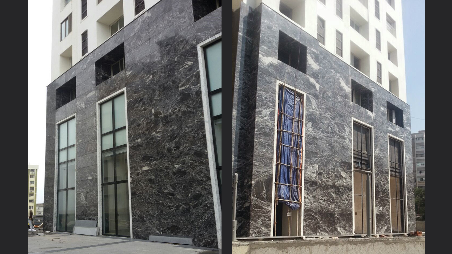 The base of a tall residencial building is clad in Ocean Black Granite. The twin structures are located very close to the sea and the entrance lobby has a huge draft of tunnel effect. The system had to be designed for extra wind pressure for this reason. The book matched granite is beautifullly clad with precision.