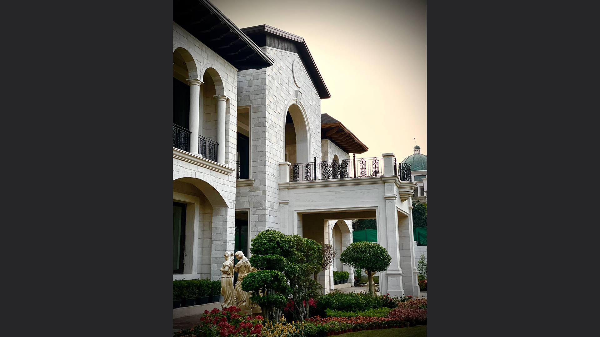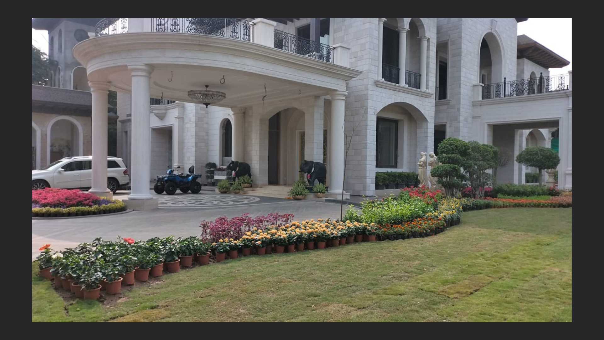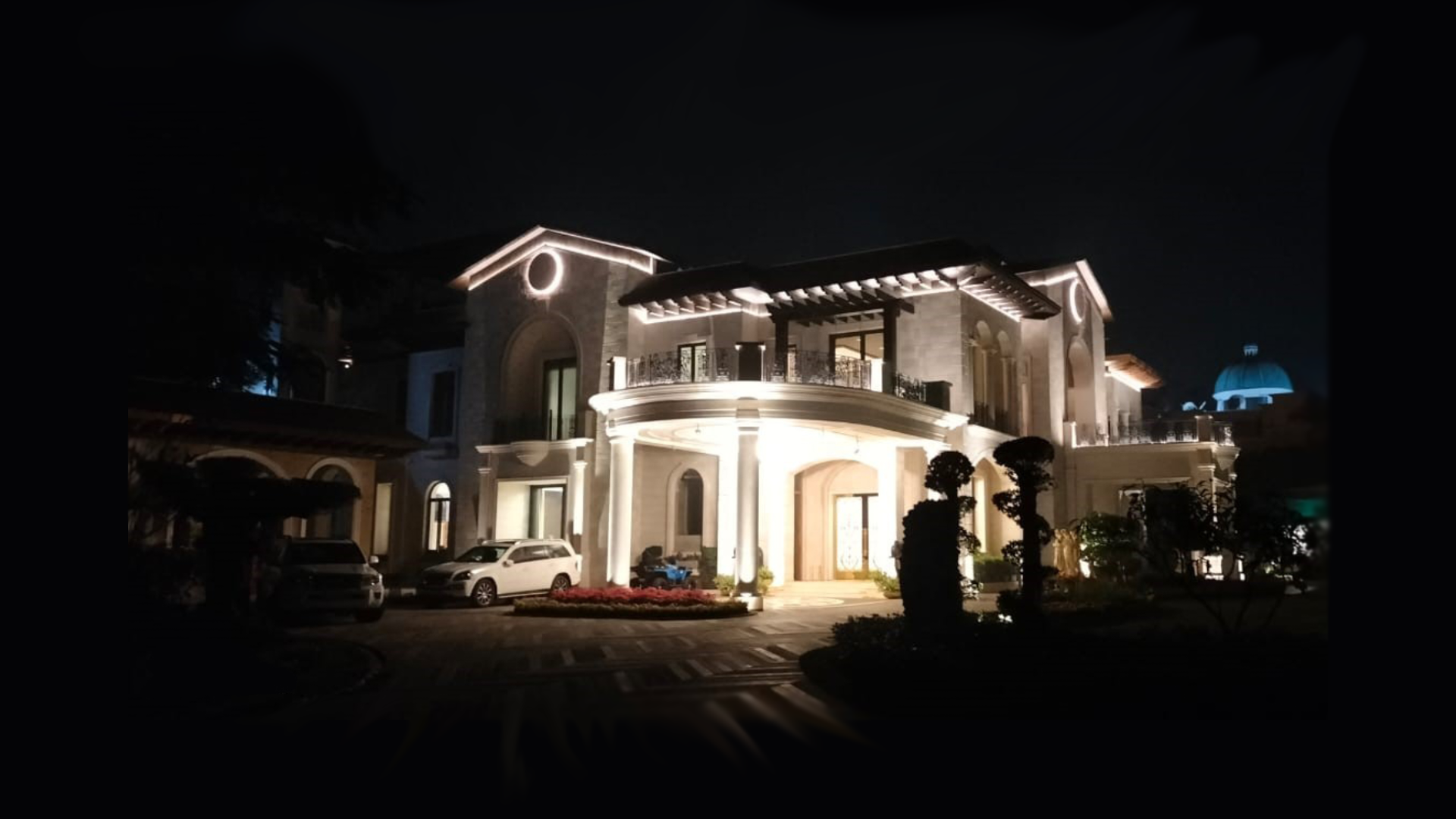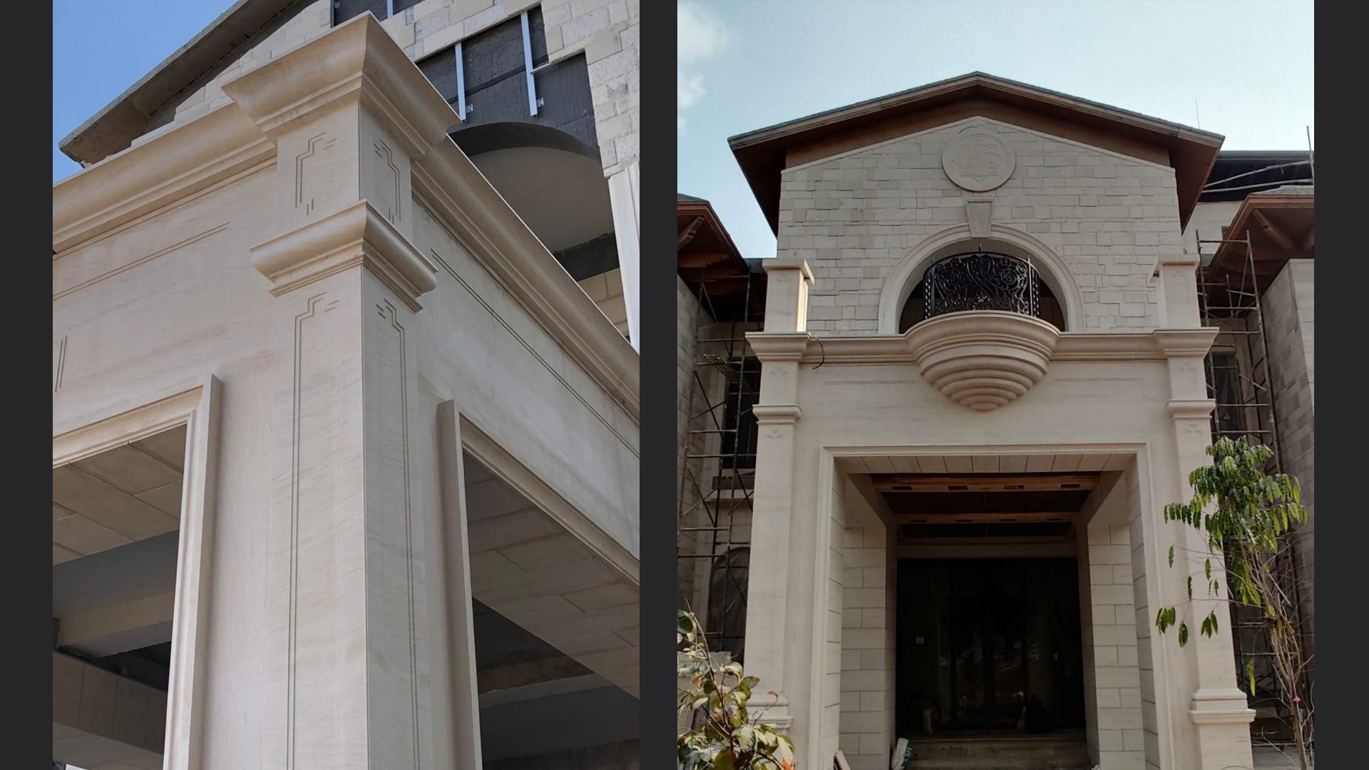 A Marvel to the eyes, the house is clad in two different textures, the rubble limestones and leather finish veined limestone from Turkey. The intircate detailing of the arched windows with columns in limestone are manufactured in the factory and installed at site. The complete rubbling in maunfactured from 20 mm thin slabe of limestane pre-fab in factory. The entrance porch is fashioned with crafted profiles and metal railing.